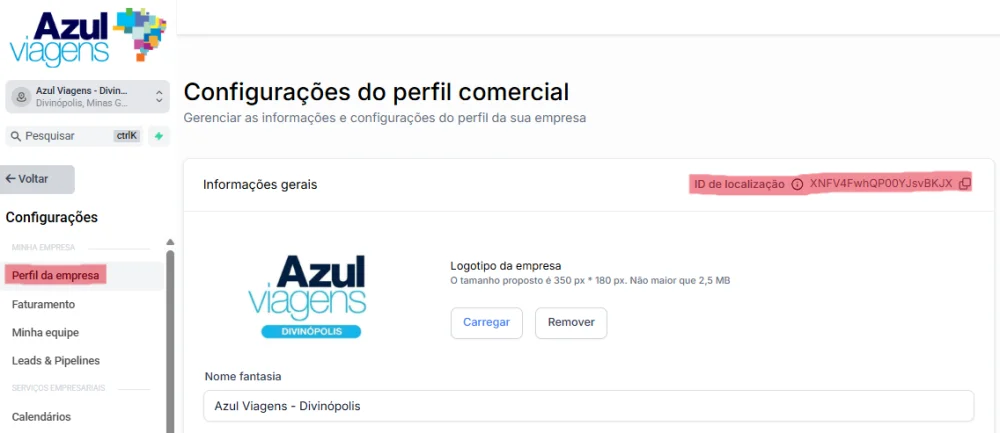 Para obter o ID da conta vá em configurações > Perfil da empresa e copie o ID da localização.